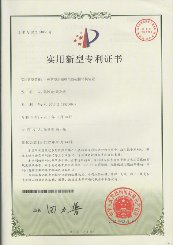 2012年03月14日,由我公司技術(shù)中心自主研發(fā)的“一種新型永磁吸吊器磁極轉(zhuǎn)換裝置“獲得實(shí)用新型專利授權(quán)。近年來,我公司一直高度重視新產(chǎn)品研發(fā)和新技術(shù)應(yīng)用,強(qiáng)化知識產(chǎn)權(quán)管理,實(shí)施專利戰(zhàn)略,以為市場提供專業(yè)化的產(chǎn)品和技術(shù)服務(wù)。